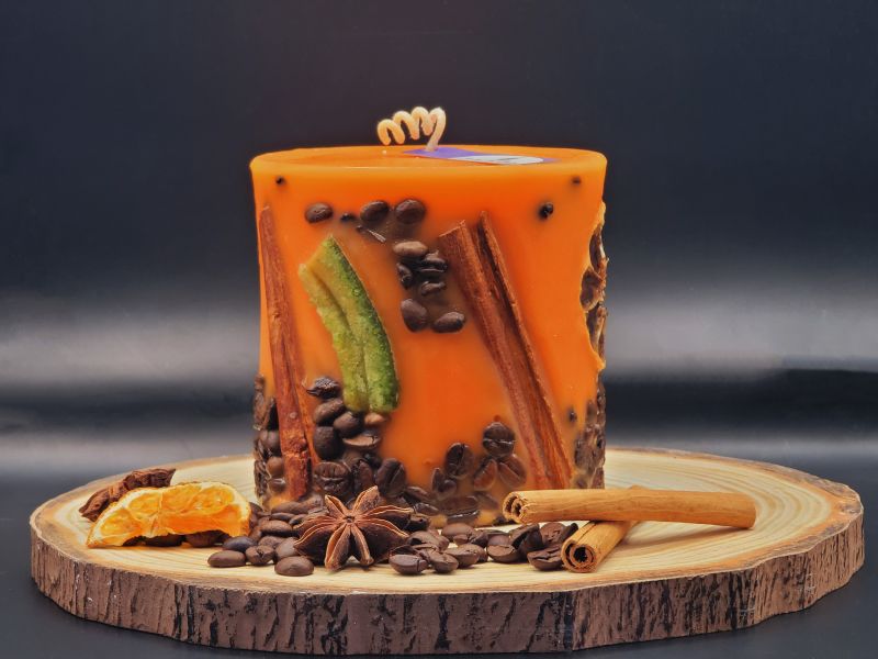 Design Unic și Rafinat: Fiecare lumânare este o operă de artă în sine, cu un design cilindric impunător, îmbogățit cu accente naturale precum boabe de cafea aromate, batoane de scorțișoară îmbietoare și felii de citrice uscate, care adaugă un plus de culoare și textură.