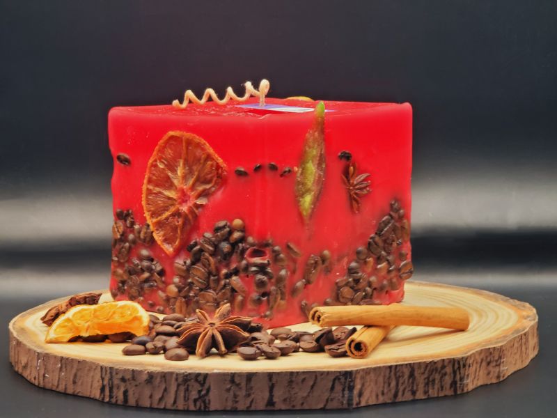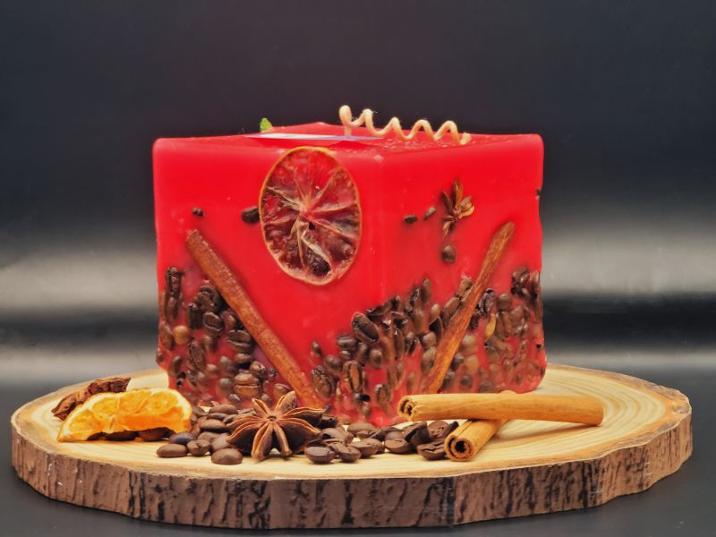 Fiecare lumânare este o operă de artă în sine. Forma sa cubică, elegantă, este îmbogățită cu elemente decorative naturale, precum boabe de cafea aromate, batoane de scorțișoară parfumate, felii de portocală uscate și anason stelat, toate armonios integrate în ceara roșie vibrantă. Aceste detalii nu doar că adaugă un plus de estetică, dar și intensifică experiența olfactivă, creând un amestec subtil de arome calde și îmbietoare.Parfum Delicat de Trandafir