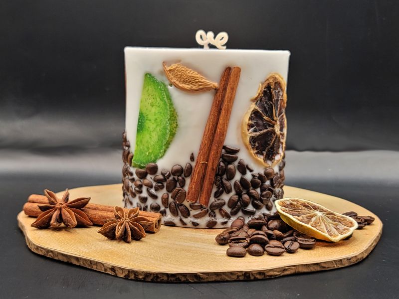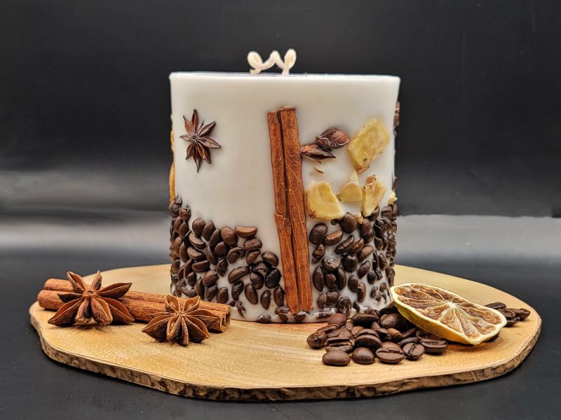 - Design Decorativ Unic: Fiecare lumânare este decorată manual cu boabe de cafea, felii uscate de citrice și batoane de scorțișoară, transformând-o într-o piesă centrală atrăgătoare.