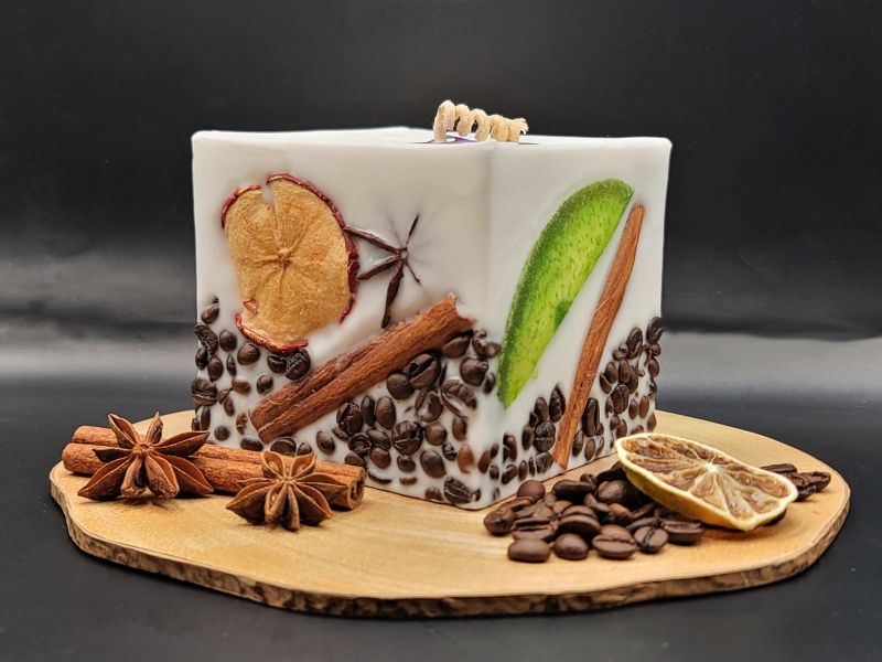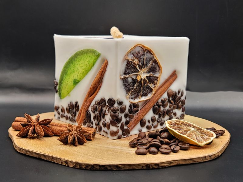 Fiecare lumânare este unică, datorită decorațiunilor realizate manual. Boabele de cafea, batoanele de scorțișoară, feliile de portocală uscată și anasonul stelat sunt integrate armonios în ceară, creând un aspect vizual deosebit. Aceste elemente naturale nu doar că îmbogățesc estetica lumânării, dar adaugă și un plus de caracter și autenticitate.