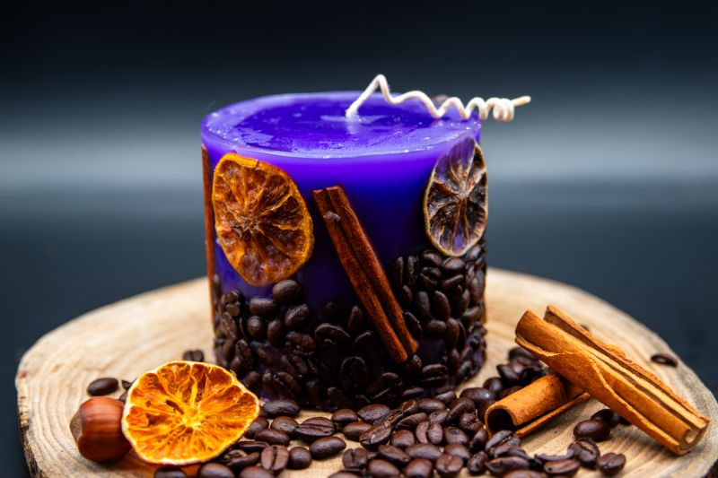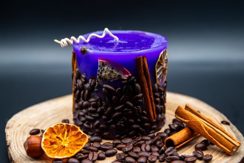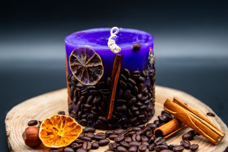 Fiecare lumânare este unică, datorită decorului său realizat manual cu ingrediente naturale. Boabele de cafea atent selecționate, batoanele de scorțișoară aromate și feliile de portocală uscată se îmbină armonios pentru a crea un aspect rustic și sofisticat. Culoarea vibrantă de lavandă a cerii adaugă o notă de eleganță și prospețime, transformând această lumânare într-un punct focal atrăgător în decorul tău.
