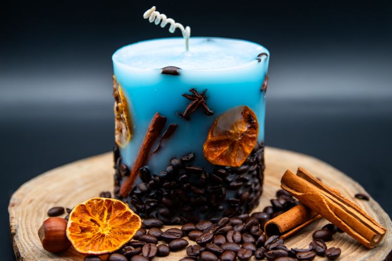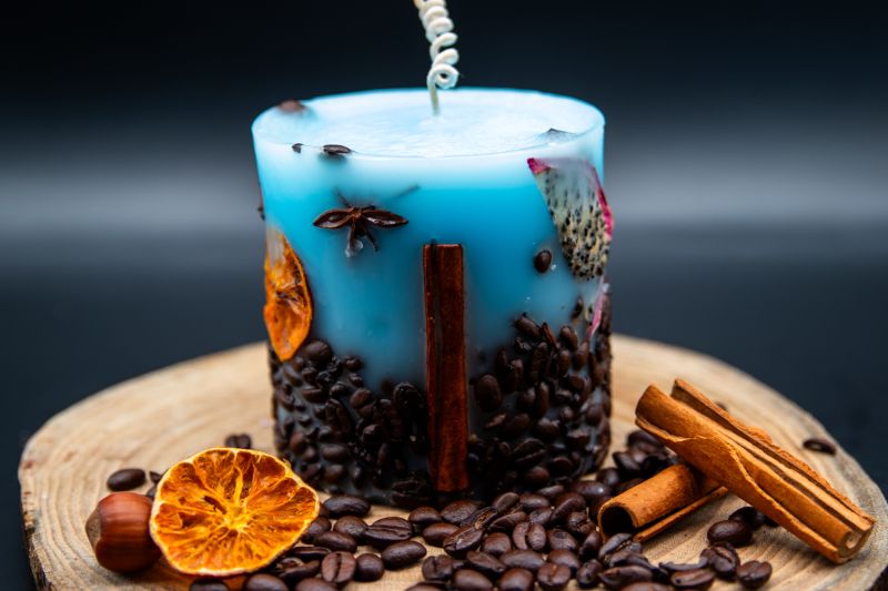 Design Inovator: Fiecare lumânare este decorată manual cu elemente naturale precum boabe de cafea, felii de portocală uscată, batoane de scorțișoară și anason stelat, oferind un aspect rustic și elegant. Culoarea albastră vibrantă a lumânării adaugă un plus de rafinament, transformând-o într-un obiect decorativ deosebit.