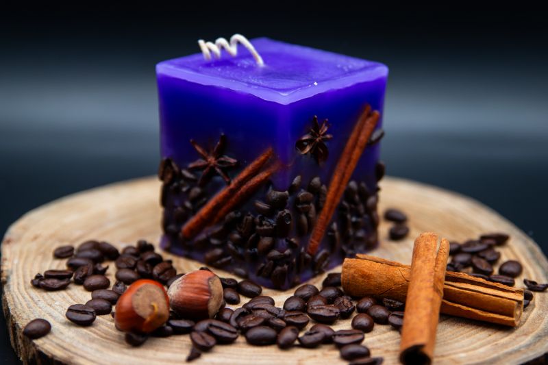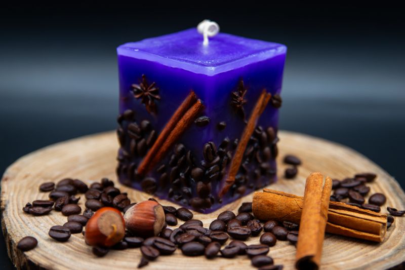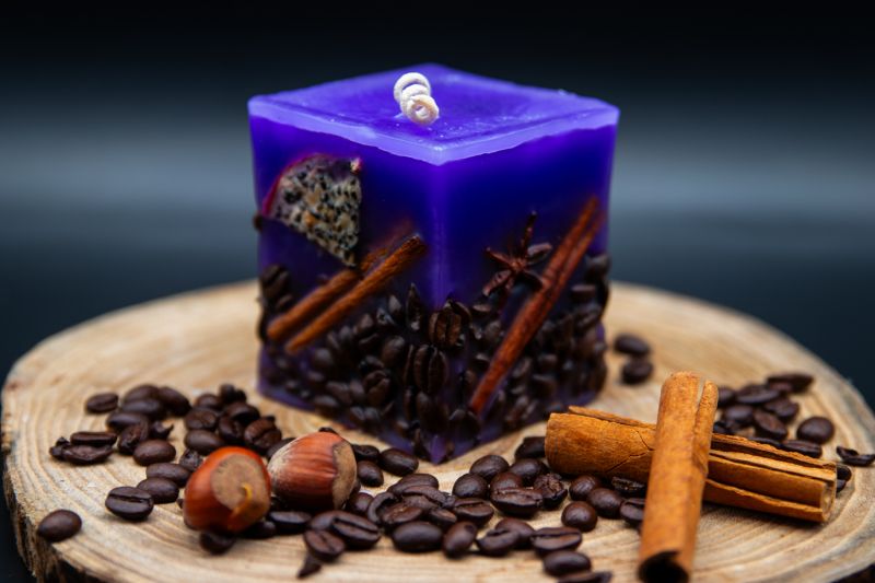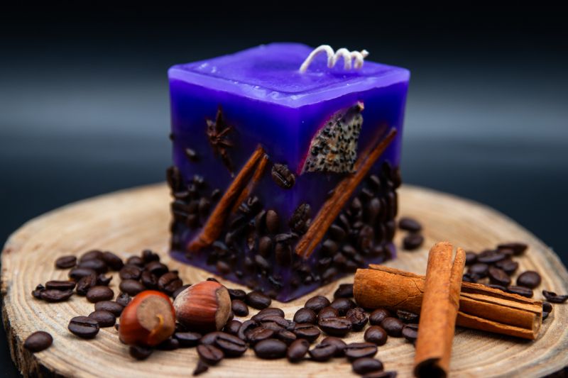 Fiecare lumânare este lucrată manual cu atenție deosebită, prezentând un design unic și atrăgător. Baza este decorată cu boabe de cafea atent aranjate, bețe de scorțișoară parfumate și anason stelat, creând un contrast vizual intrigant cu nuanța vibrantă de mov a lumânării. Aceste elemente naturale nu doar îmbogățesc estetica, ci și completează subtil aroma de lavandă, adăugând note calde și îmbietoare.