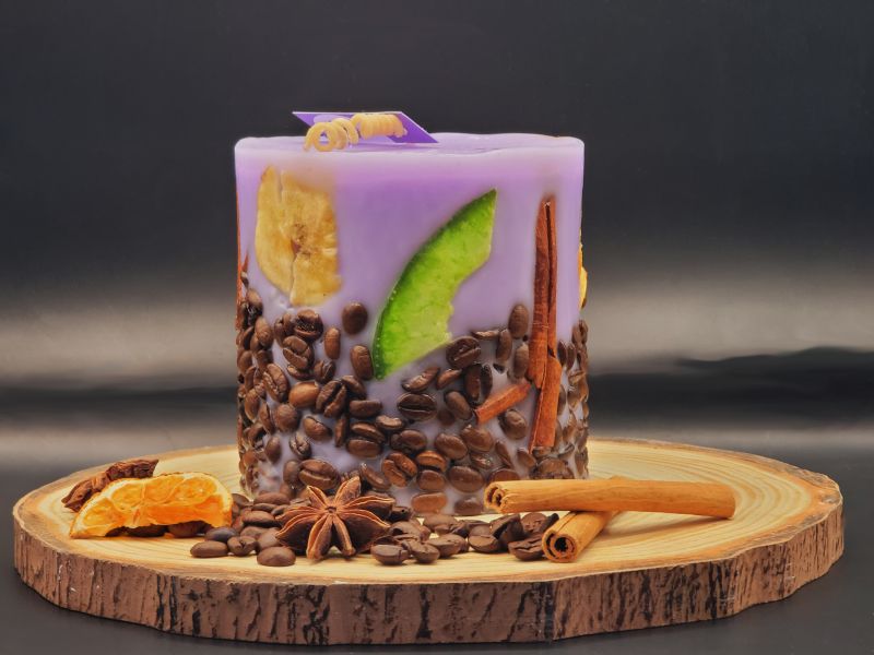 Lumânarea noastră se remarcă prin designul său distinctiv, fiind decorată manual cu elemente naturale precum boabe de cafea aromate, batoane de scorțișoară îmbietoare și felii de fructe uscate. Aceste detalii adaugă un aspect rustic și sofisticat, transformând lumânarea într-o adevărată operă de artă.