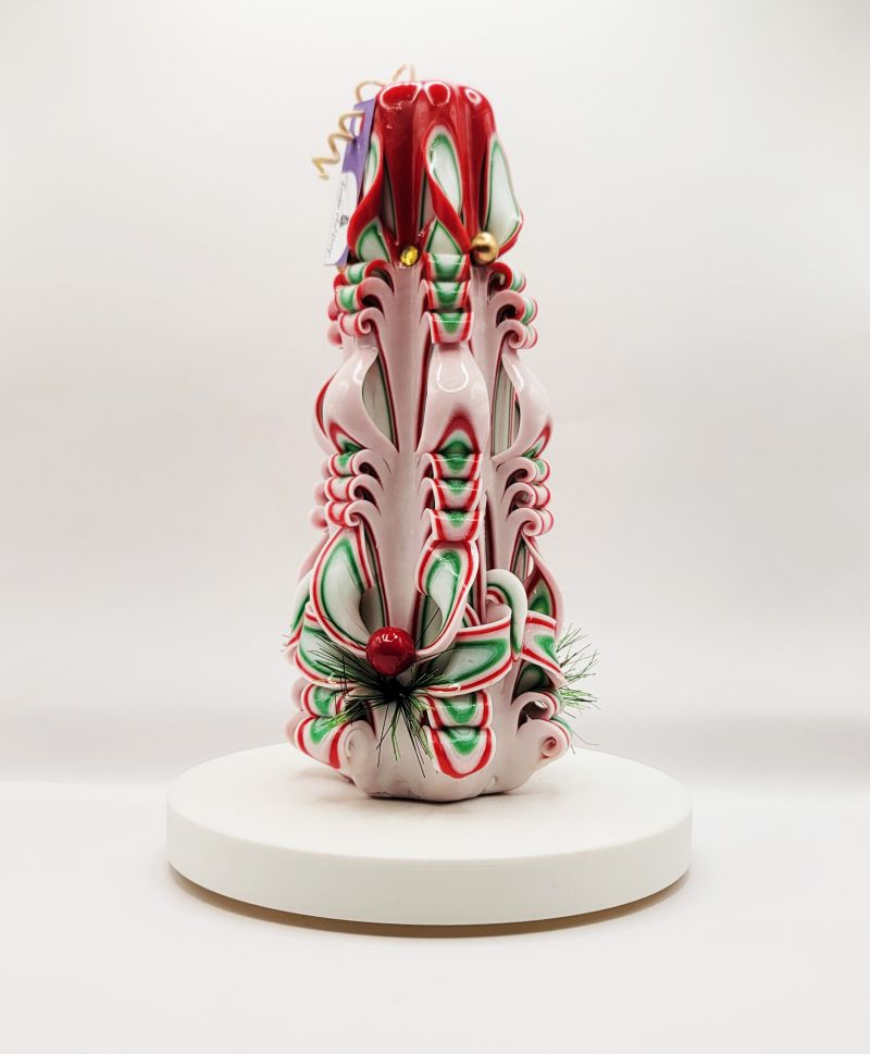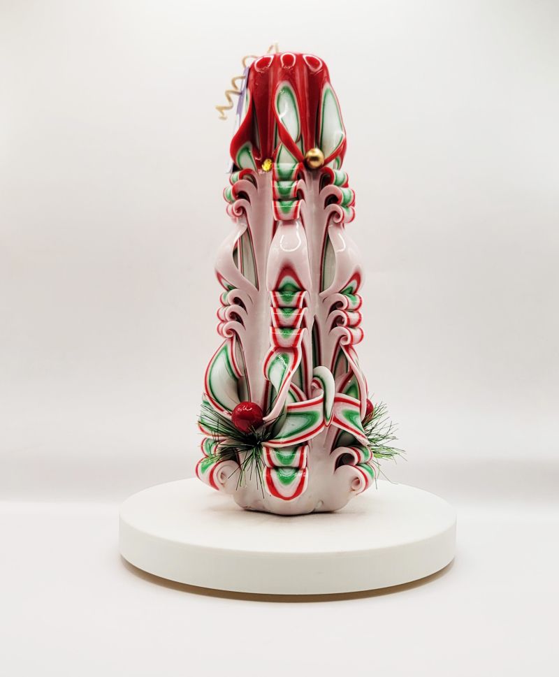 Fiecare lumânare este o expresie a măiestriei artizanale, fiind sculptată manual cu o precizie remarcabilă. Ceara prinde viață sub forma unei sculpturi complexe, unde culorile vibrante de roșu, verde și alb se îmbină armonios pentru a evoca atmosfera Crăciunului. Accentele subtile, precum miniaturile de brad și detaliile aurii, adaugă un plus de rafinament și eleganță, transformând această lumânare într-un obiect decorativ de excepție.