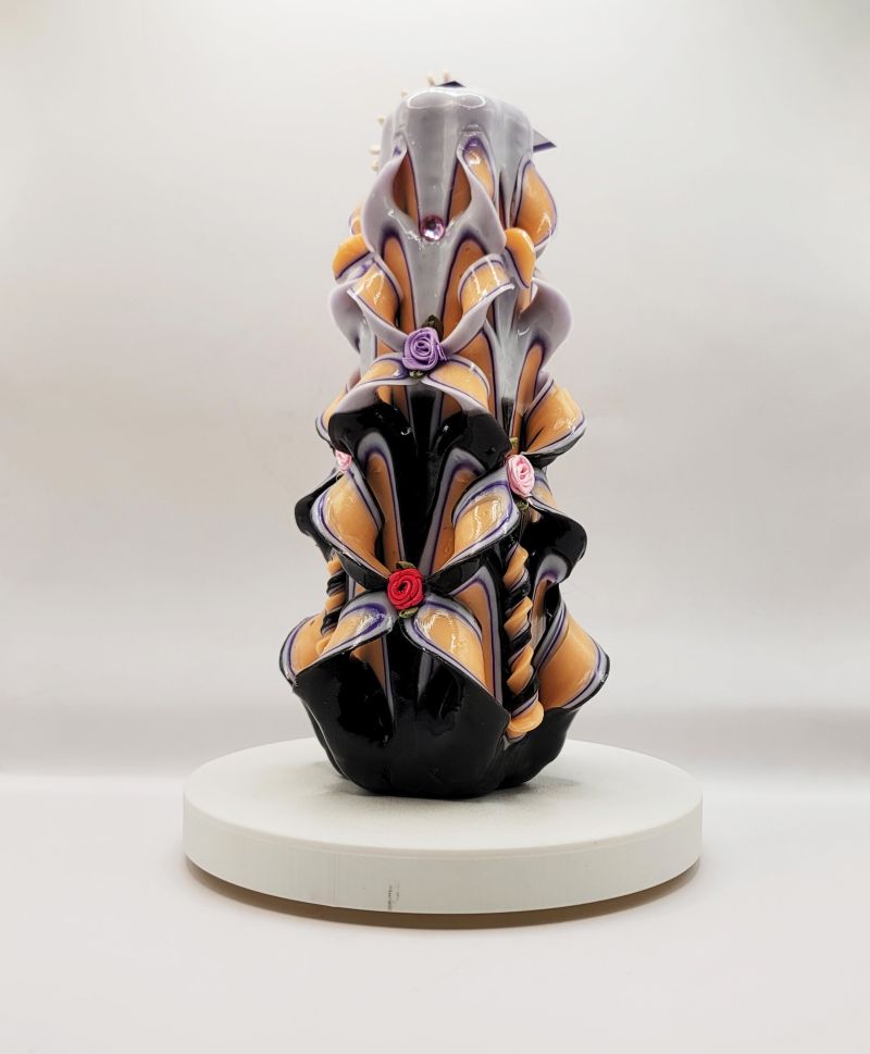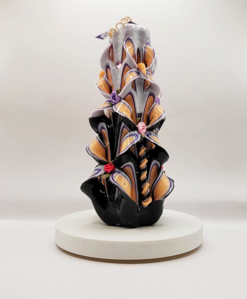 Fiecare lumânare este meticulos sculptată manual, rezultând o piesă unică, cu detalii impresionante. Combinația de culori – negru profund, accente de gri elegant, nuanțe aurii și tușe subtile de roșu și mov – evocă misterul și frumusețea unei nopți senine. Fiecare detaliu este realizat cu precizie, de la petalele delicate ale trandafirilor decorativi până la curburile grațioase ale formelor sculptate.