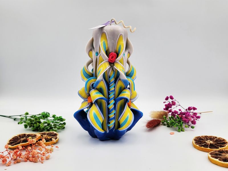 Cu o înălțime de 16 cm, această lumânare nu este doar o sursă de lumină, ci o piesă centrală care atrage toate privirile. Nuanțele de albastru oceanic se împletesc armonios cu accente subtile de culori contrastante, creând un efect vizual captivant și relaxant. Fiecare detaliu sculptat manual reflectă măiestria artizanului, transformând lumânarea într-o adevărată operă de artă.
