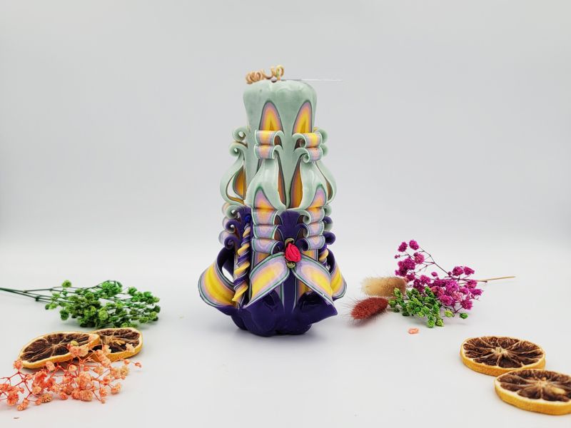 Lumânarea Sculptată Manual "Bohemian Green" este o explozie de culoare și originalitate. Cu o înălțime de 16 cm, această lumânare atrage atenția prin detaliile sale fine și combinația vibrantă de verde, galben și accente subtile de violet. Fiecare tăietură și curbură este realizată cu precizie, transformând ceara într-o sculptură delicată.